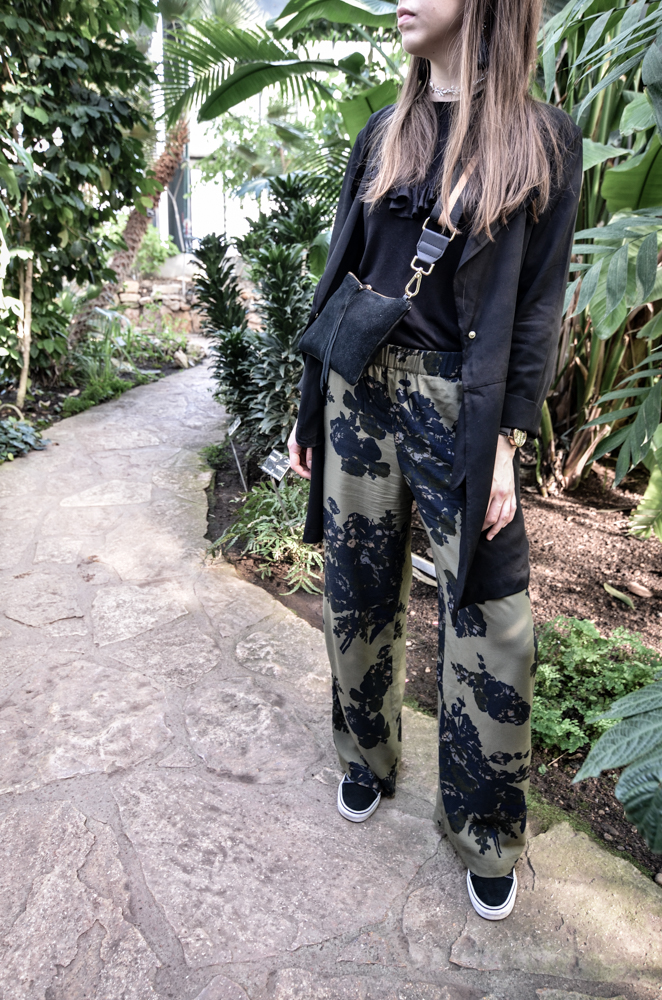 Du coup, c'est au milieu des palmiers, bananiers et autres plantes que je vous retrouve avec ce pantalon palazzo, que j'aime tant ! Le confort de ce truc franchement, j'ai envie de le mettre tous les jours ! Un petit tshirt noir à volants, ma paire de vans avec les gros lacets des puma, un choker et c'est tipar !